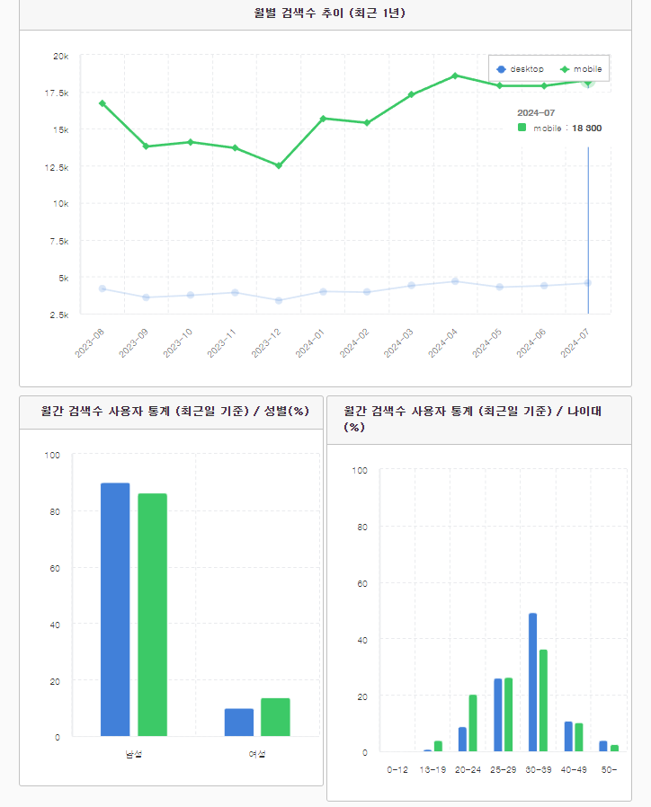 반대로 여성분들은 모바일로 검색하시는 분들이 더 많습니다. 연령별로 보면 30대 분들의 조회수가 가장 많은걸로 확인이 됩니다. 그 중에서도 PC조회수가 높은걸 보니 남성분들이 더 많이 조회하는걸로 확인할 수 있습니다.