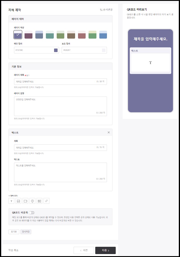 보통 식당에서는 메뉴판이나 와이파이를 코드에 넣어서 사용하시는 곳들도 있고 자체제작 하시는 곳들도 있습니다. 사업체에 필요한 부분을 선택해서 진행하시면 됩니다. 선택하고 "다음" 클릭