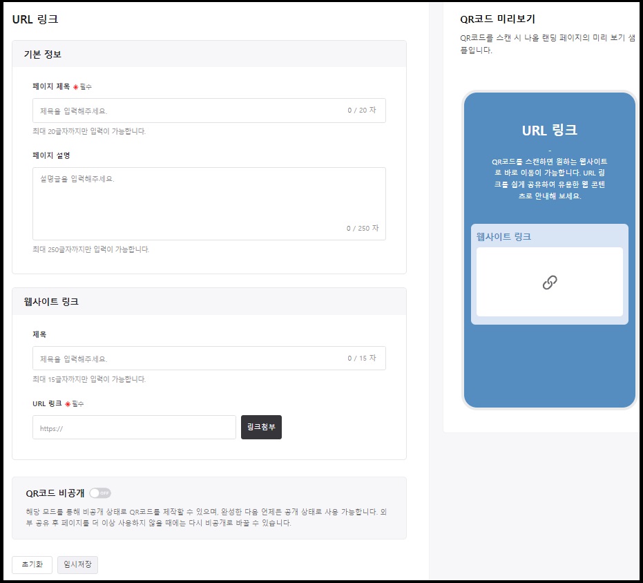 페이지 유형에는 URL링크, 명함, 메뉴판, 초대장, 와이파이, 쿠폰, 안내문, 자체제작이 있습니다. 보통은 URL 링크를 많이 사용합니다. 스캔 시 처음에 나오는 페이지이니 참고 부탁드립니다.