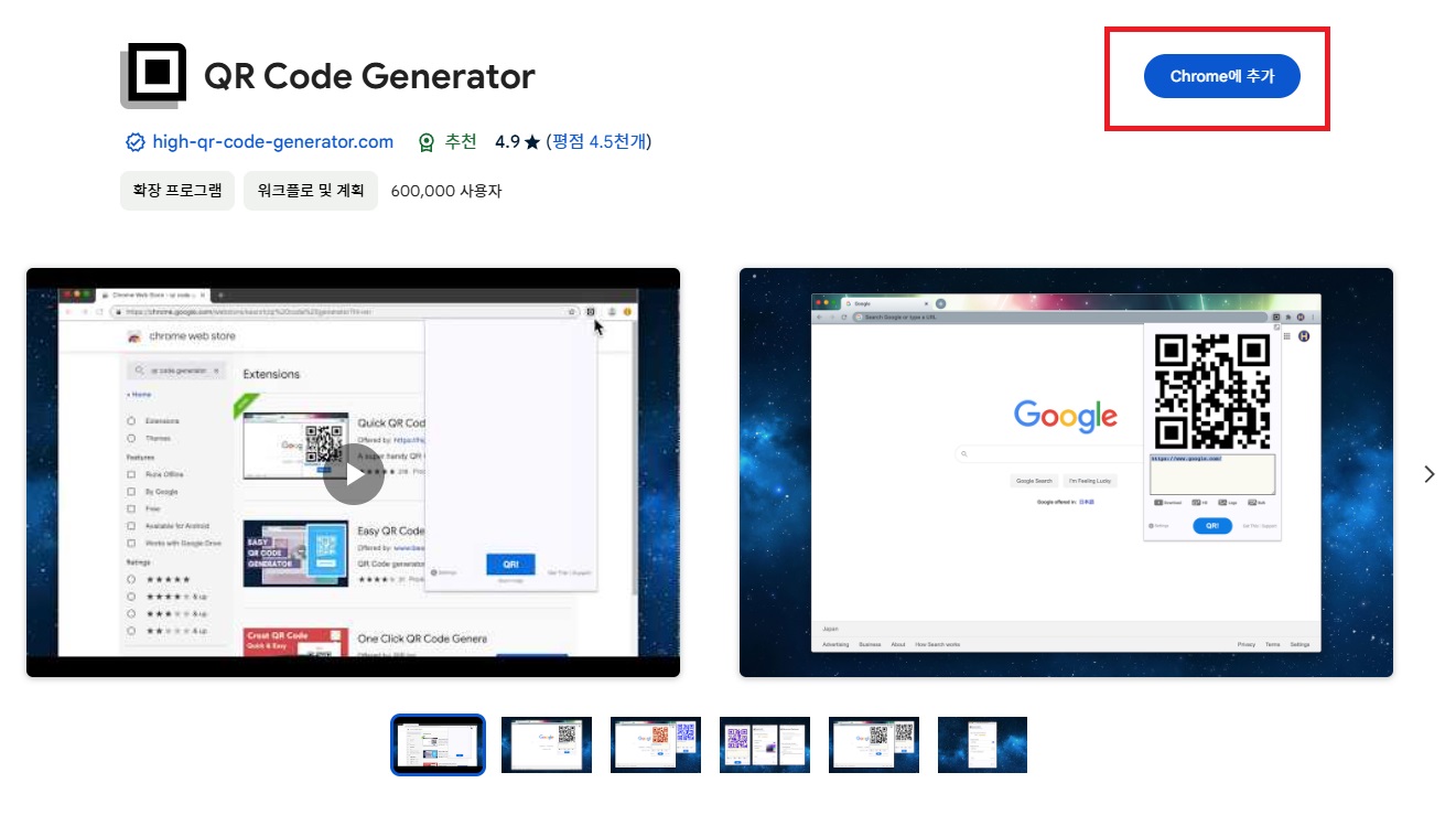 4. 클릭 후 <QR Code Generato> 확장 프로그램 "Chrome 추가" 버튼을 클릭해 줍니다.